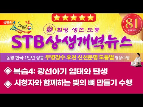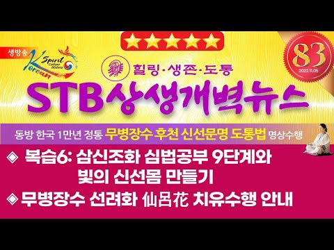 <프로그램>1) 지구촌 개벽뉴스2) 삼랑선도담https://www.youtube.com/watch?v=E0BaXG4oHlk&t=712s- 주제 : 빛의 신선몸 만들기- 진행 : 권영미/ 양철호00:00 STB상생개벽뉴스 83회 11월 5일 (토)│복습6: 삼신조화 심법공부 9단계와 빛의 신선몸 만들기 0:50 오프닝 멘트 1:35 오늘의 … 더보기