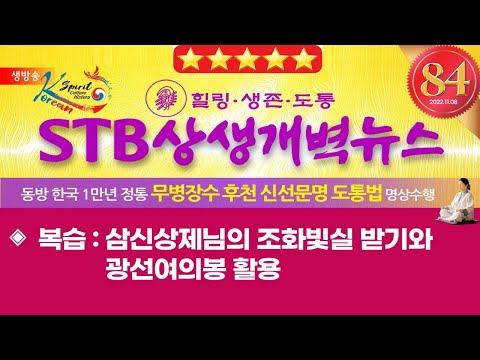 <프로그램>1) 지구촌 개벽뉴스2) 삼랑선도담- 주제 : 조화빛실받기와 광선봉치유https://www.youtube.com/watch?v=q6iFhHcNDEY&t=683s 정단형성과 언청계용신- 진행 : 원유근/ 차유리, 김재훈00:00 STB상생개벽뉴스 84회 11월 8일 (화) | 복습: 삼신상제님의 조화빛실 받기와 광선여의봉 활용 0… 더보기